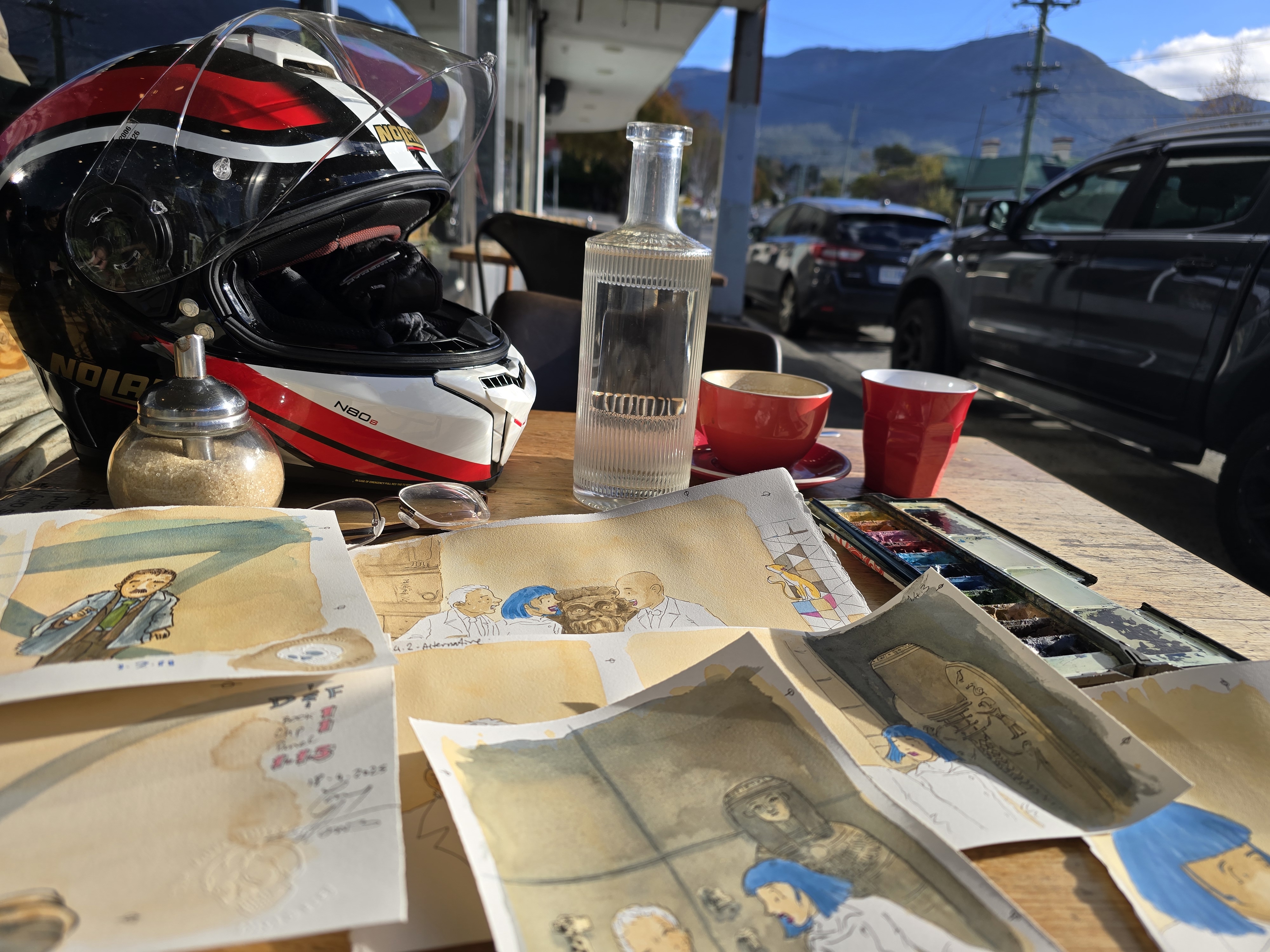 Once the planning is done, I can work on final illustrations anywhere with enough space. I choose cafés where I’m less likely to be bumped or where the tables are large enough—especially when working on large-format illustrations.