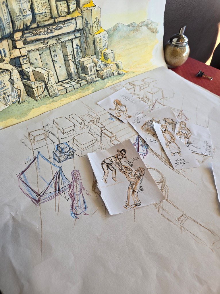 This is one of my favourite stages. I sketch fast and loose—sometimes dozens of versions of a character or scene. It’s messy, experimental, and often only makes sense to me. I treat it like casting actors, testing wardrobe, and scouting locations for a visual story.