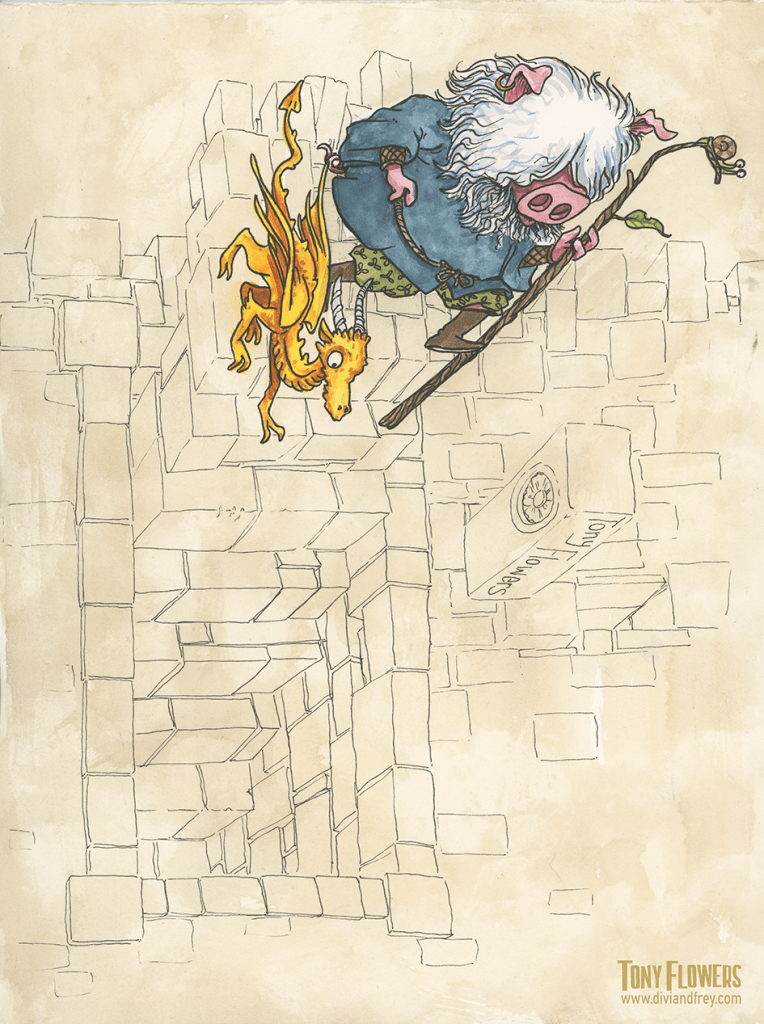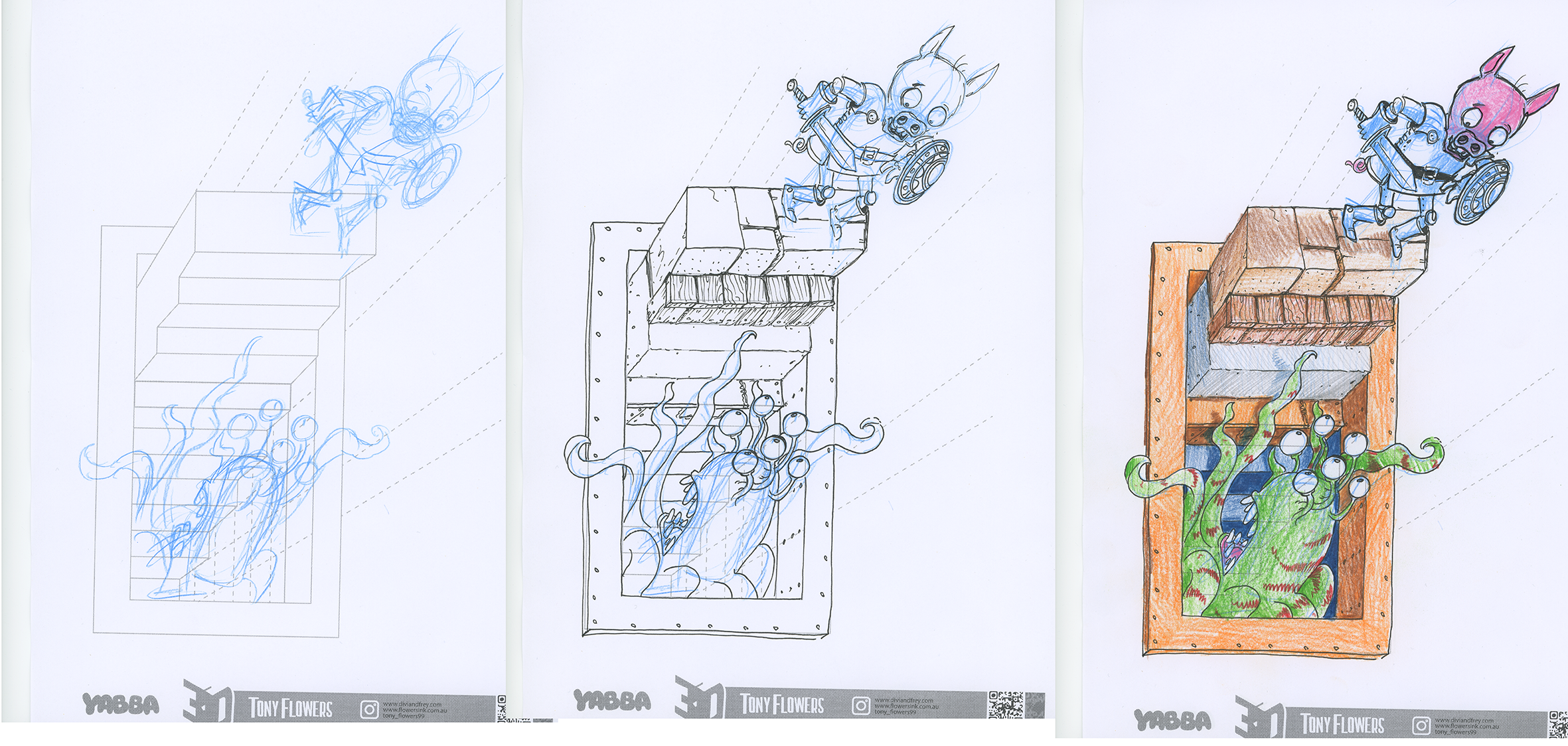 Single‑point perspective illusions use one vanishing point to trick the eye into seeing depth on a flat surface. When all the lines in a drawing angle toward the same point, your brain automatically interprets the image as 3D, even though it’s completely flat. This is the foundation (used below) behind that ladder that seem to rise out of one page on to the next the page; And the doorway that appear to sink inward, and characters that look like they’re floating in front of the paper.