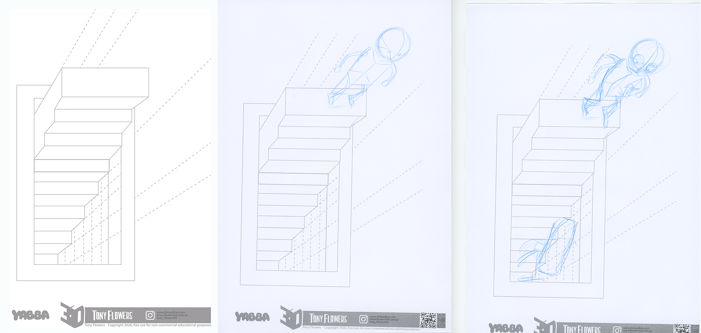 Challenge option: Extend additional objects beyond the staircase, e.g., a hand reaching out, a signpost leaning toward the viewer.