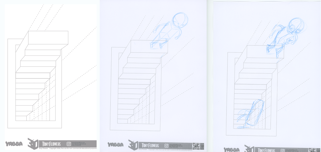 - Students should draw over the template to create the staircase rising out of the “hole,” following the grid lines to keep angles accurate.