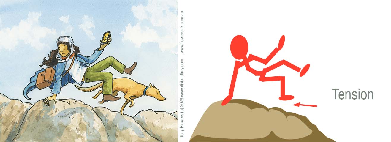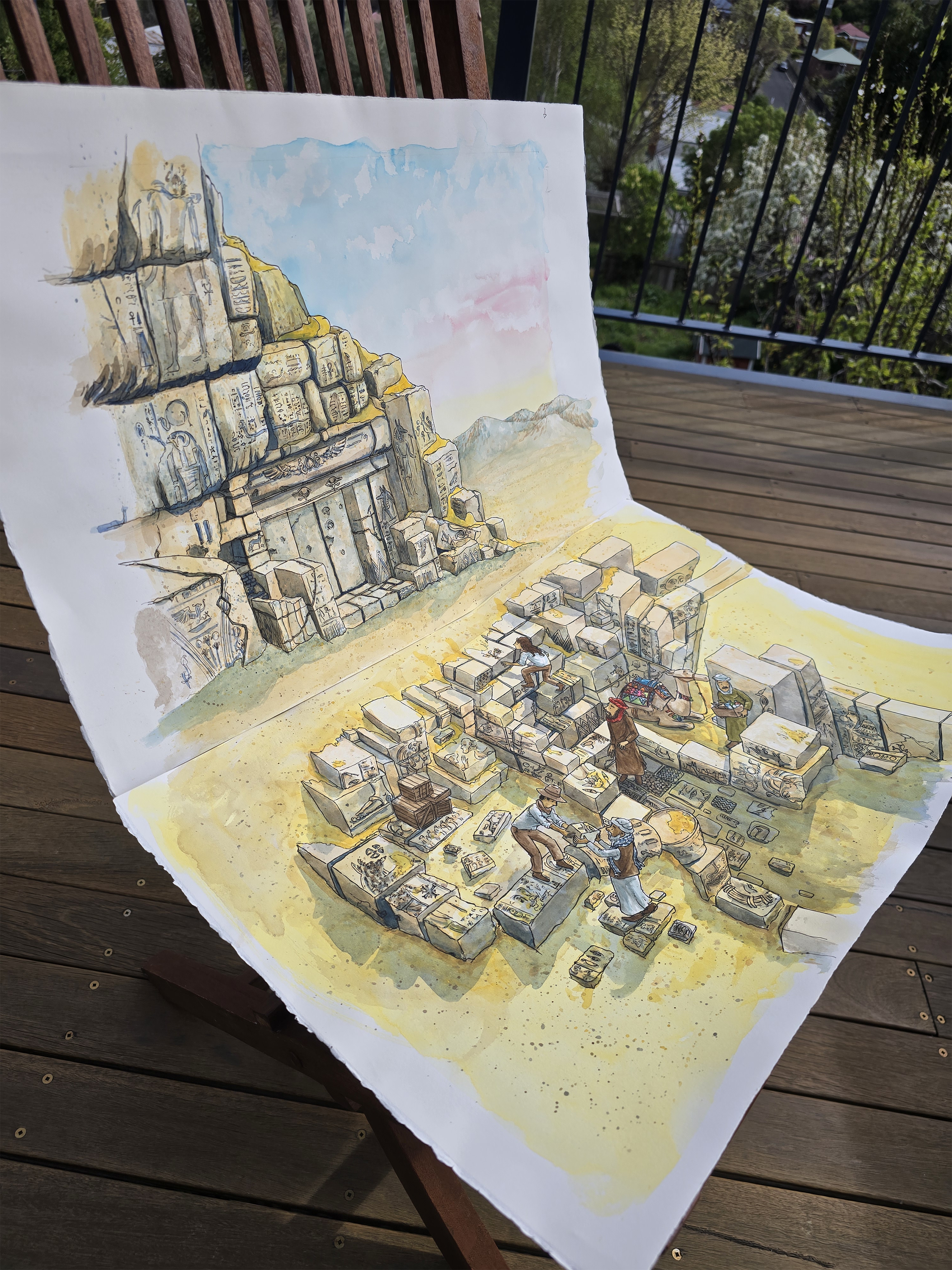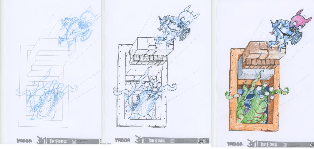 In my upcoming graphic novel Divi and Frey, I use single‑point perspective illusions to create scenes that feel dynamic, dramatic, and immersive. Whether it’s a staircase rising toward danger, a cavern dropping away beneath the characters, or an object bursting toward the reader, these illusions help guide the eye and build tension. They allows the reader experiences the story world in a unique way.