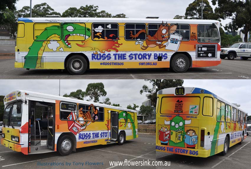 There will be a brightly coloured/illustrated bus called ‘Russ the story bus’ travelling round Western Sydney. Stopping at Schools in the region. I had the pleasure of creating the illustrations for the bus. It is the first time that my illustrations will appear on the side of such a large vehicle. I’m looking forward to getting some good photos. I will be touring for 3 day on the bus (December the 1st, 2nd and 4th).